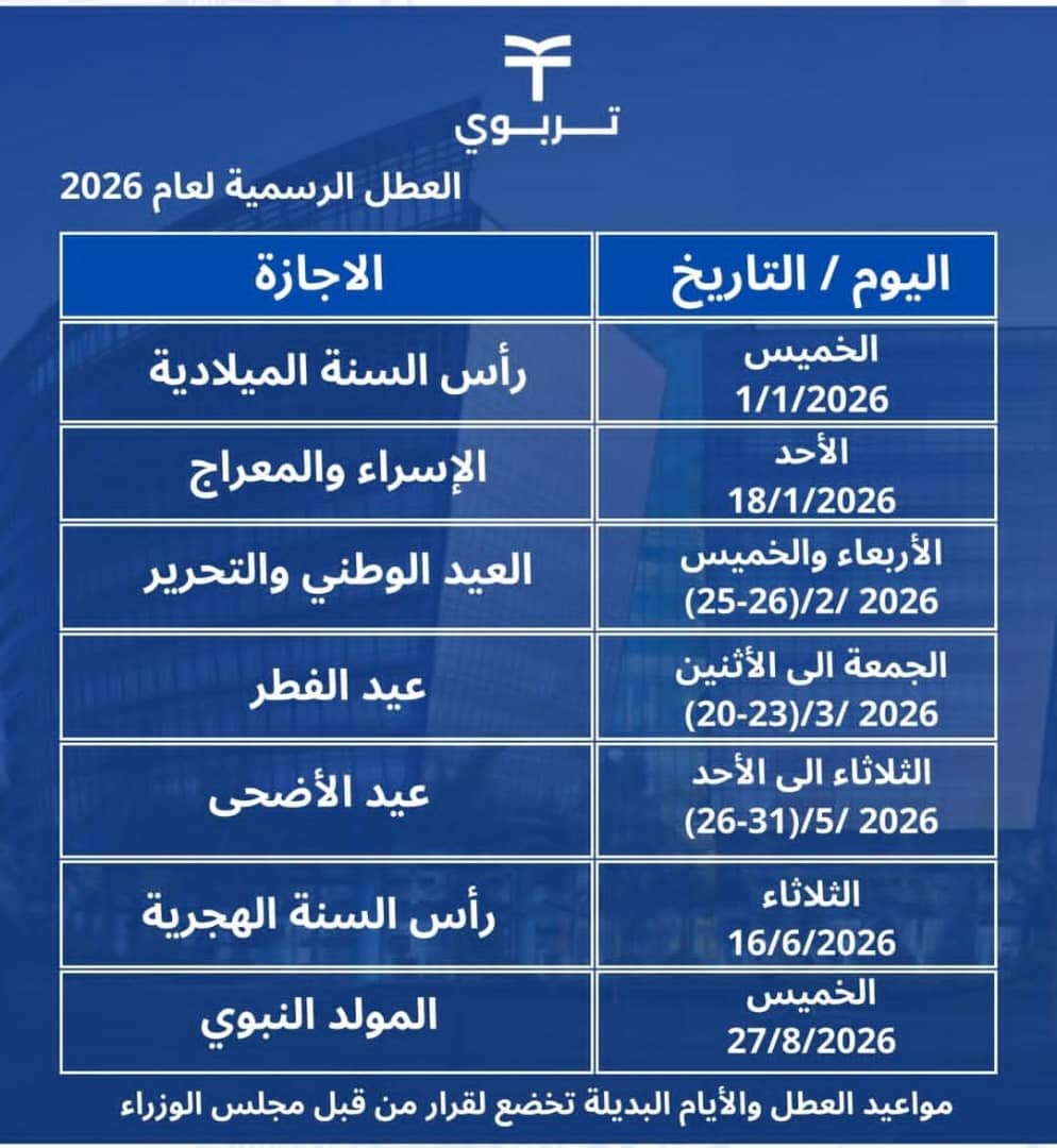 - تبدأ عطلة الإسراء والمعراج يوم الجمعة 16 يناير وتنتهي مع نهاية يوم الأحد 18 يناير 2026.